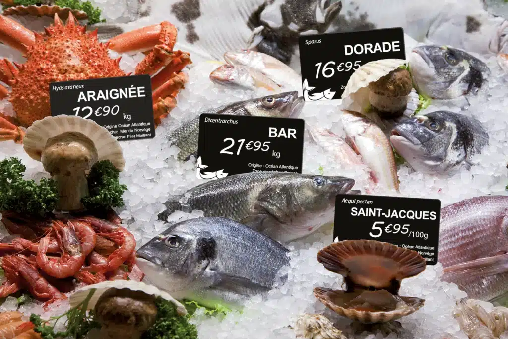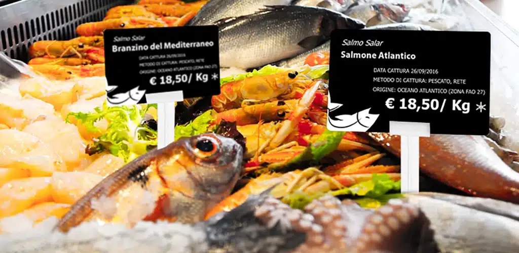 鮮明で耐久性に優れたプロ仕様の価格ラベルで、魚介類をアピールしましょう。Edikioはシンプルでエレガントなソリューションです。